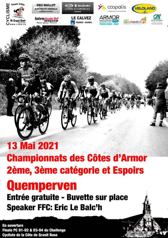 Etant donné le contexte sanitaire actuel, et en concertation avec le Comité des fêtes de Quemperven, le CD22, le Comité de Bretagne et les dirigeants du TCGR, le Championnats des Côtes d'Armor des 2e,3e catégorie et Espoirs qui devait avoir lieu le jeudi 13 mai 2021 est annulé. Une nouvelle date courant 2021 pourra être envisagée en concertation avec les différentes entités organisatrices. Les épreuves Pass-Cyclisme D1-D2 (finale Challenge de la Côte de Granit Rose 2020-21) et Pass-Cyclisme D3-D4 (finale Challenge de la Côte de Granit Rose 2020-21) sont également annulées à cette date.
