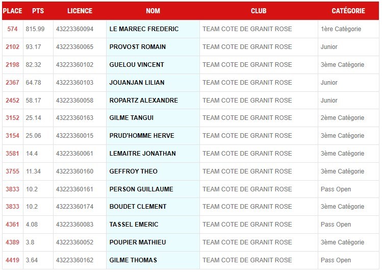 Le classement complet est disponible en cliquant sur le lien suivant avec le numéro du club (4322336) : http://www.ffc.fr/classement-national-par-points/