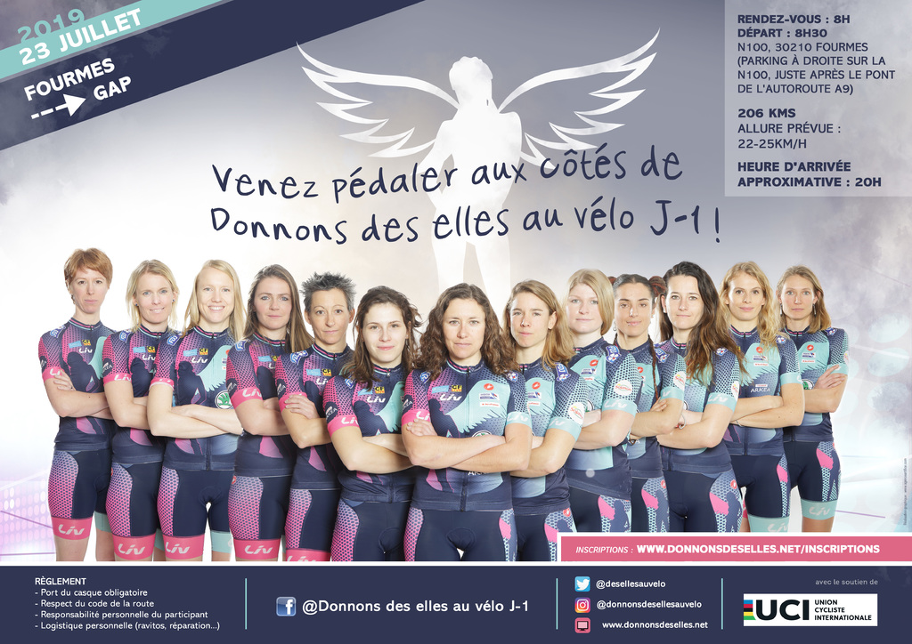 Pour sa 5ème édition, le projet Donnons des Elles au vélo J-1 est reparti à l'assaut du goudron depuis le 5 juillet et jusqu'au 27 juillet 2019 entre Bruxelles et Paris Champs-Elysées afin d'assurer la promotion du cyclisme au féminin sur les routes de France et agir pour l'organisation d'une course par étapes féminine médiatisée en France. Soutenues par l'UCI, 13 femmes se sont lancées le défi de réaliser 3500 km en 21 jours pour l'égalité femme/homme dans le domaine du sport et plus particulièrement du cyclisme. Ce Team effectue toutes les étapes du Tour de France une journée avant les hommes. L'année dernière, plusieurs jeunes du Team Côte De Granit Rose avaient effectué les 40 derniers km de l'étape Brest/Mur de Bretagne accompagnés de Laurenn THOS, leur encadreur et suivi par la voiture du club pilotée par Karine CHIPAULT avec comme mécano Céline PROVOST.