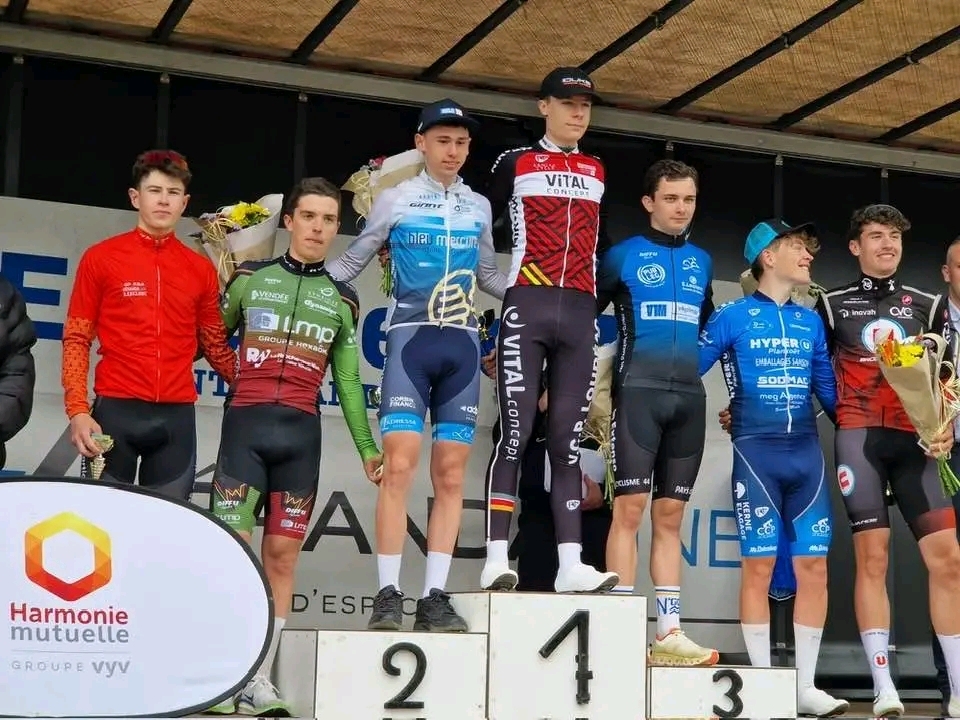 KBA VÉRANDALINE Fédérale U19 : Le team Côte Granit Rose était bien représenté avec 10 coureurs. On a vu du orange toute la journée ce qui était le but.Matis Boussougan et Lucas Cogen ont fait la course devant. Ses collègues Elouan Courteaux, Élian Quere et Marin Le Coz ont protégé l’échappée. Malheureusement pour eux c’est revenu proche de l’arrivée car Loudéac défendait le maillot de leader. Résultat sprint massif pour la 2 eme place ( donc résultats Matis Boussougan 23ème du général, Marin Le Coz 25ème ,Maël Guittet Grard 36ème , Lucas Cogen 38ème, Joan Gicquel 40ème, Elian Quéré 42ème. Et Surtout un numéro de notre Lucas Cogen toute l’après midi dans les grimpeurs . Résultat un beau maillot Rouge sur le podium , course Très bien organisée par notre ami Jean Marc Robin . 👍beau résultat collectif car ils ont montré le maillot.
