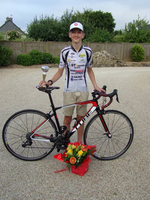 Très belle course de nos minimes, Corentin PRIMARD, Adrien CHIPAULT et Gurvan LOZAHIC restent toujours au contact du peloton. Ils lancent des attaques mais seront repris et c'est au dernier tour qu'Adrien CHIPAULT bien placé effectue son sprint pour monter sur le podium puisqu'il termine 2 ème derrière Faustine COGUENEC AC Gouesnou.